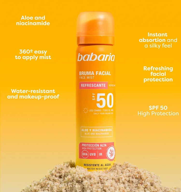 اسپری ضد آفتاب صورت باباریا babaria حاوی SPF 50 حجم 75 میل